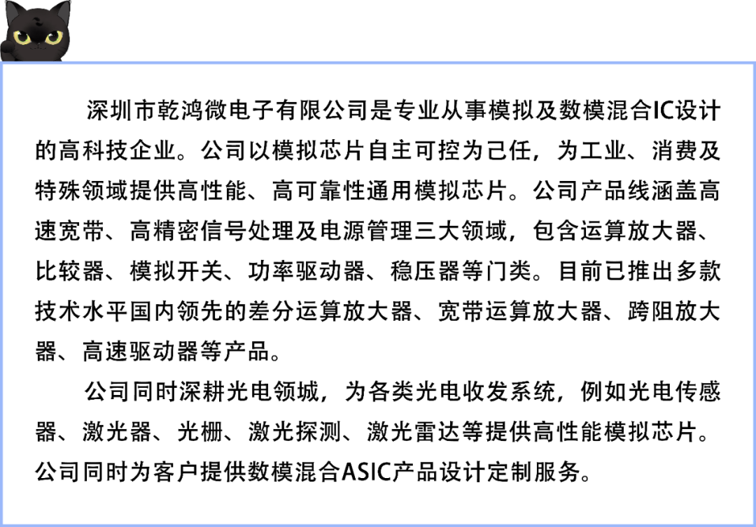 乾鴻微電子(四川)有限公司是專業從事模擬及數模混合芯片設計的高科技企業。公司創立于深圳,由四川總部和深圳子公司(深圳市乾鴻微電子有限公司)組成。